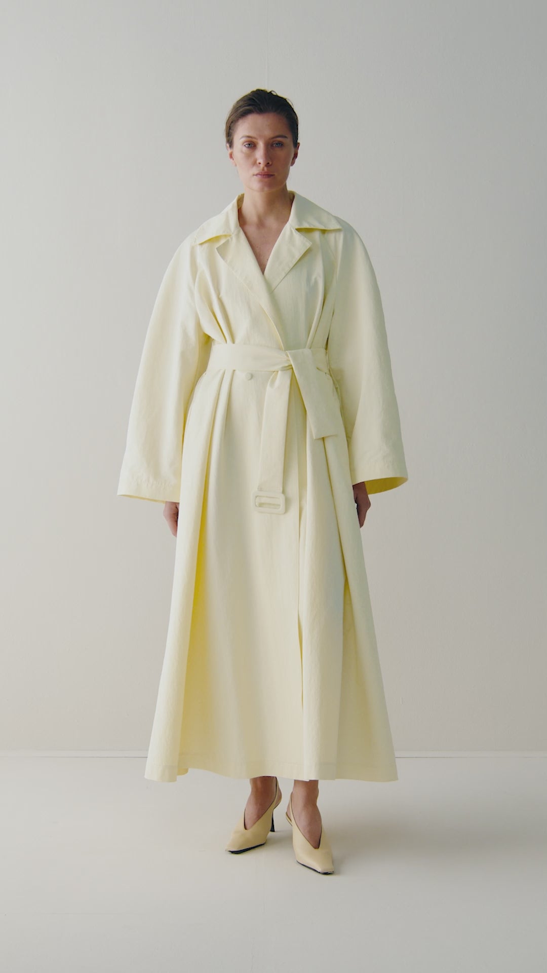 Максі тренч із подовженим силуетом і м’якою лінією плеча. Легка плащівка формує довгу, спокійну форму. Пояс вводить можливість трансформації: силует може залишатися вільним або набувати більш зібраного окреслення. Форма зберігає стриману цілісність у русі, залишаючись гнучкою у способах носіння.