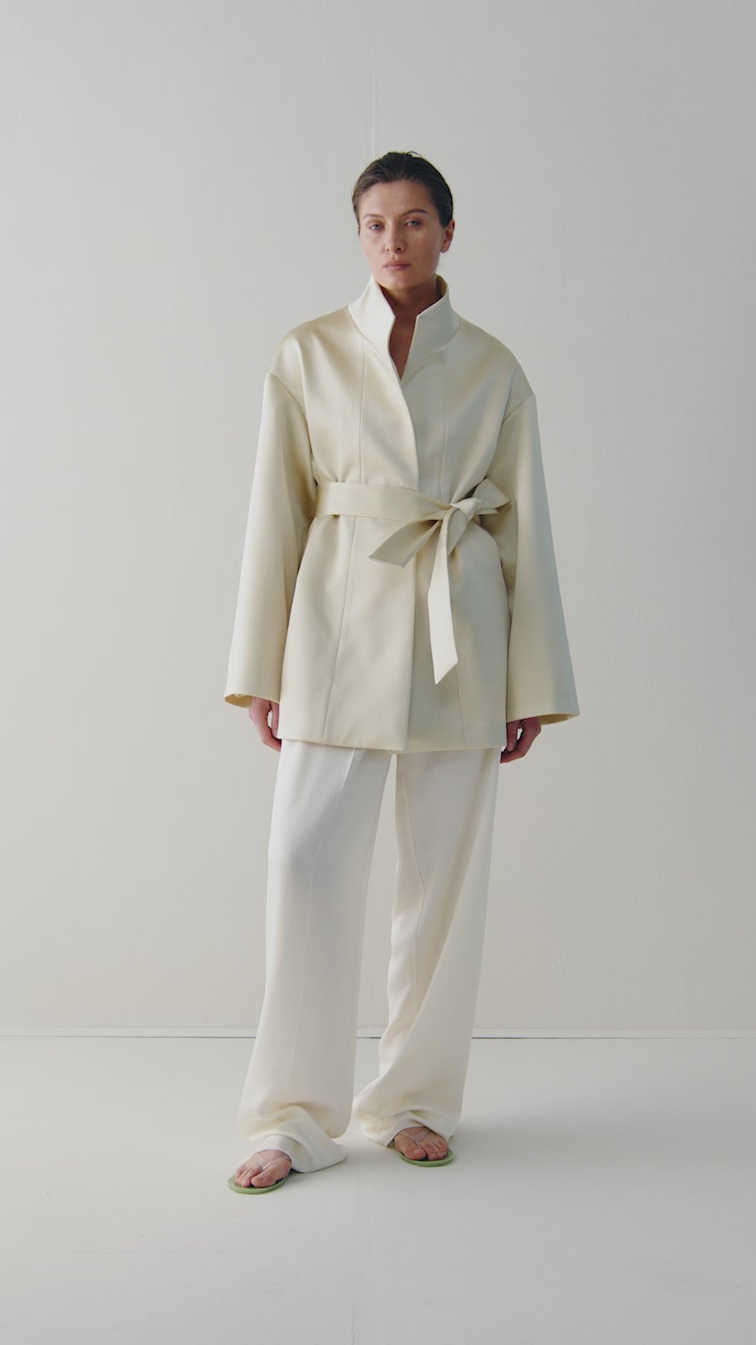 A straight-cut jacket with a high stand-up collar and belt. The shape gently hugs the body, creating a calm, cohesive silhouette. In this interpretation, the sardak exists as a shape that gently holds the silhouette—it is light, restrained, and multifunctional.