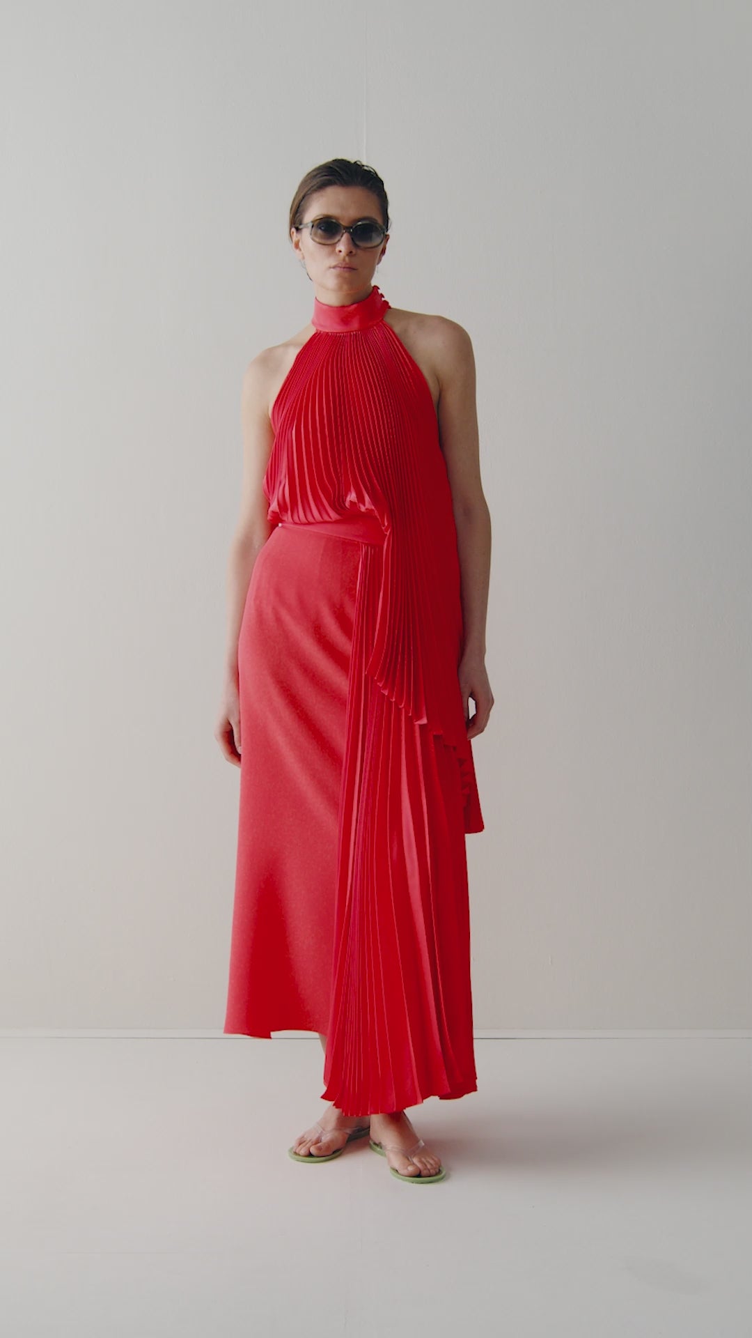 A top featuring a soft vertical pleat and asymmetrical hem. The surface of the pleats reacts to movement, changing density and direction, giving the shape a lively and changeable look. The high neckline gathers the fabric at the top, allowing it to flow freely downwards. The intense red enhances the rhythm of the pleats, introducing a sense of energy and pulse to the silhouette.