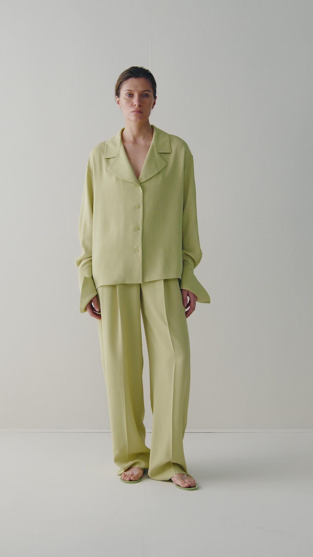 Блуза прямого силуету з відкритим коміром і подовженими манжетами. Матеріал м’яко спадає вздовж тіла, зберігаючи спокійну, зібрану форму. Чіткість ліній поєднується з текучістю тканини, дозволяючи формі вільно змінюватися в русі.