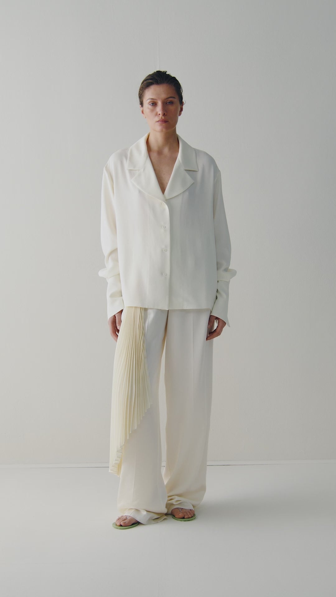 Брюки прямого силуету з високою посадкою, побудовані на чіткій вертикалі складок. Тканина формує подовжені передні стрілки, що спадають рівно вздовж ноги, зберігаючи стабільність форми. Пояс окреслює верхню лінію, від якої об’єм розгортається вниз у чітку архітектуру силуету.